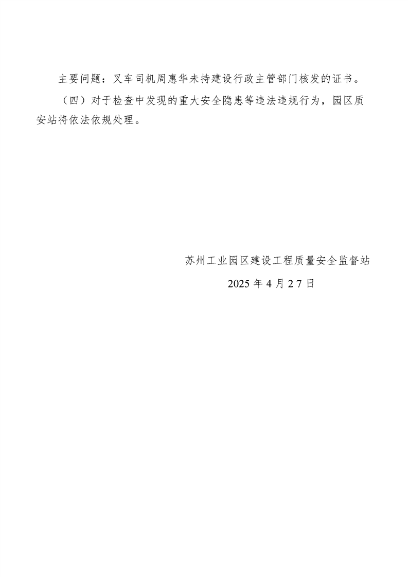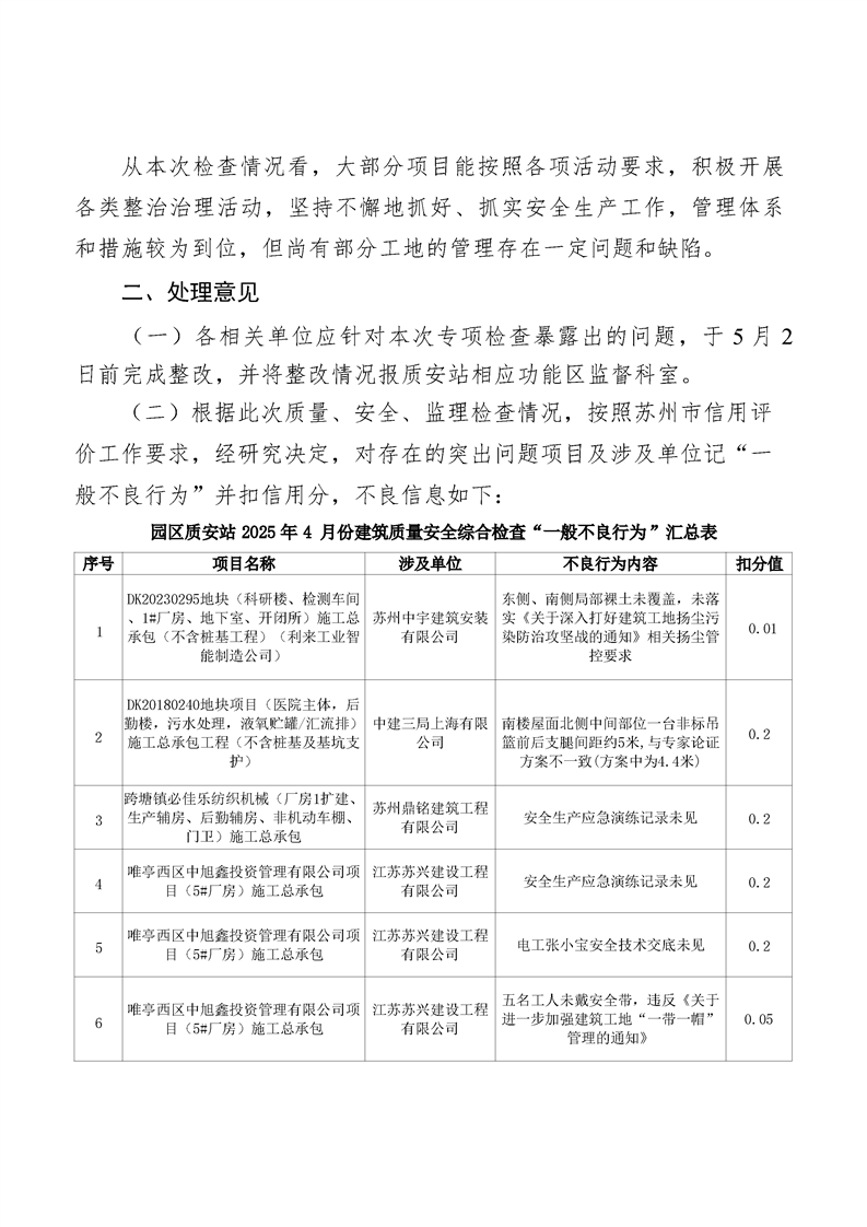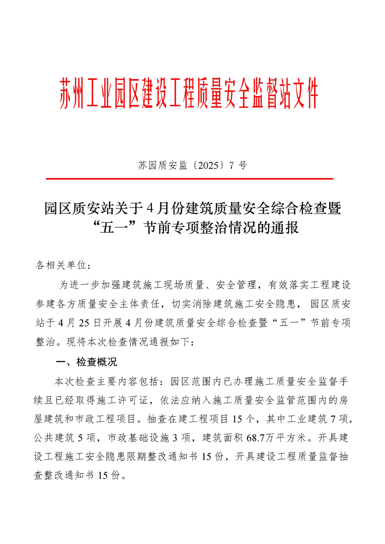 園區質安站關于4月份建筑質量安全綜合檢查暨節前專項整治情況的通報