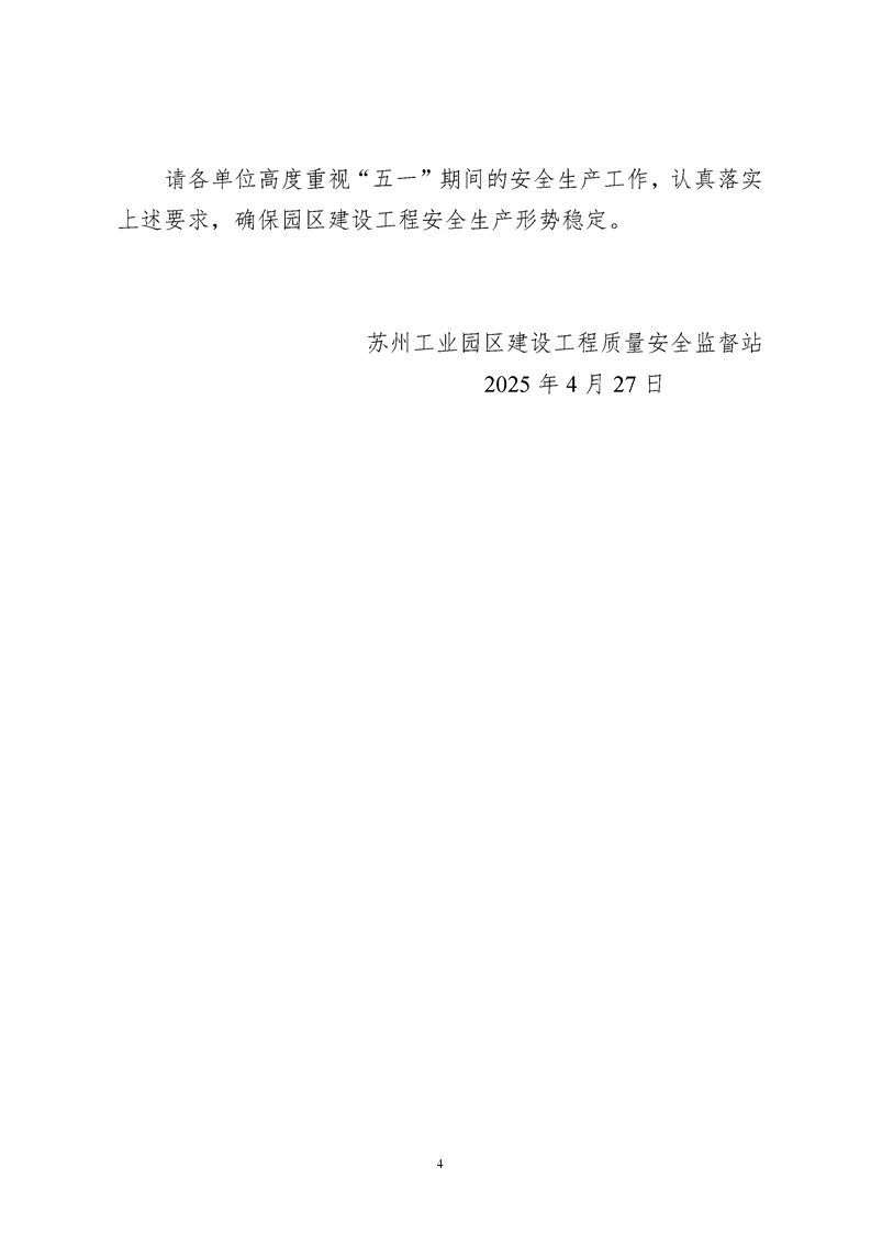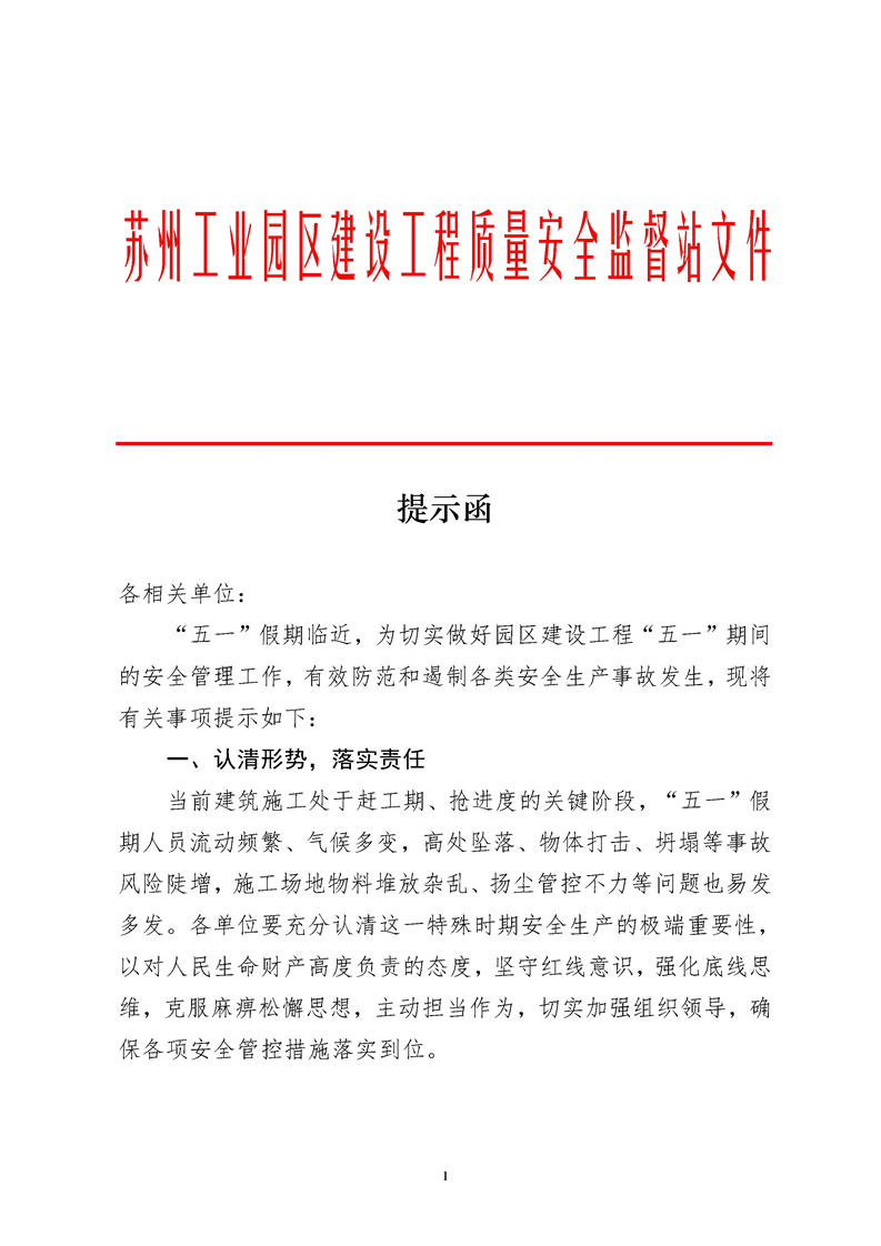 蘇州工業園區建設工程“五一”期間安全管理提示函