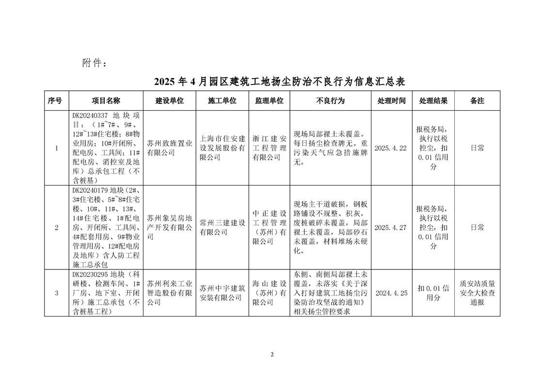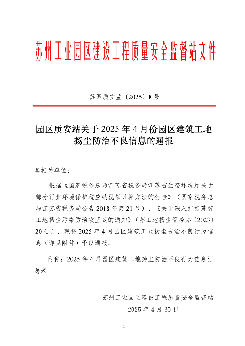 園區質安站關于2025年4月份園區建筑工地揚塵防治不良信息的通報