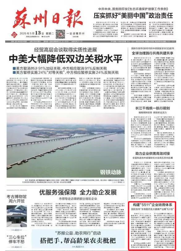 5月13日,《蘇州日報》頭版關注蘇州工業園區發布“生物醫藥及大健康產業騰飛計劃”,構建“5511”企業培育體系。