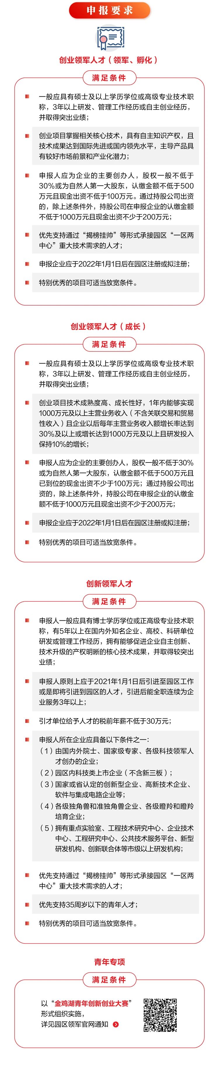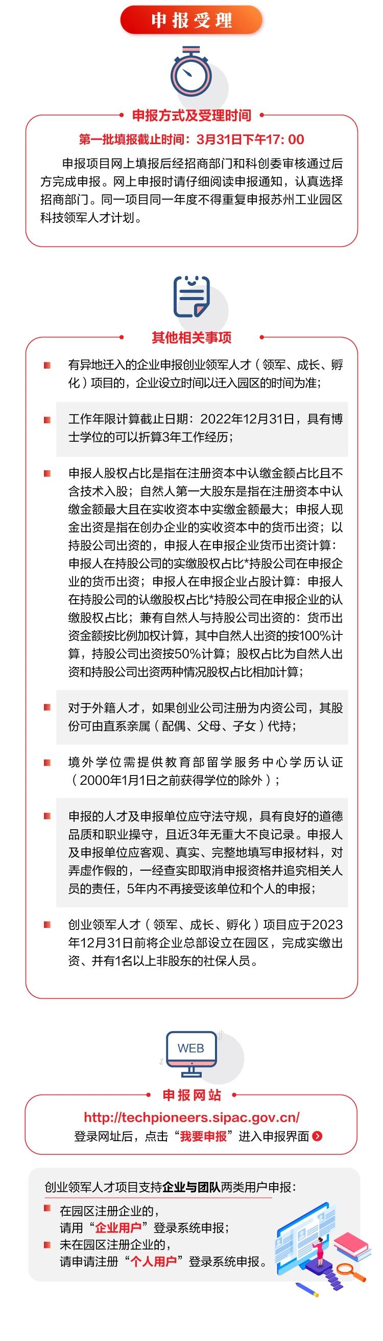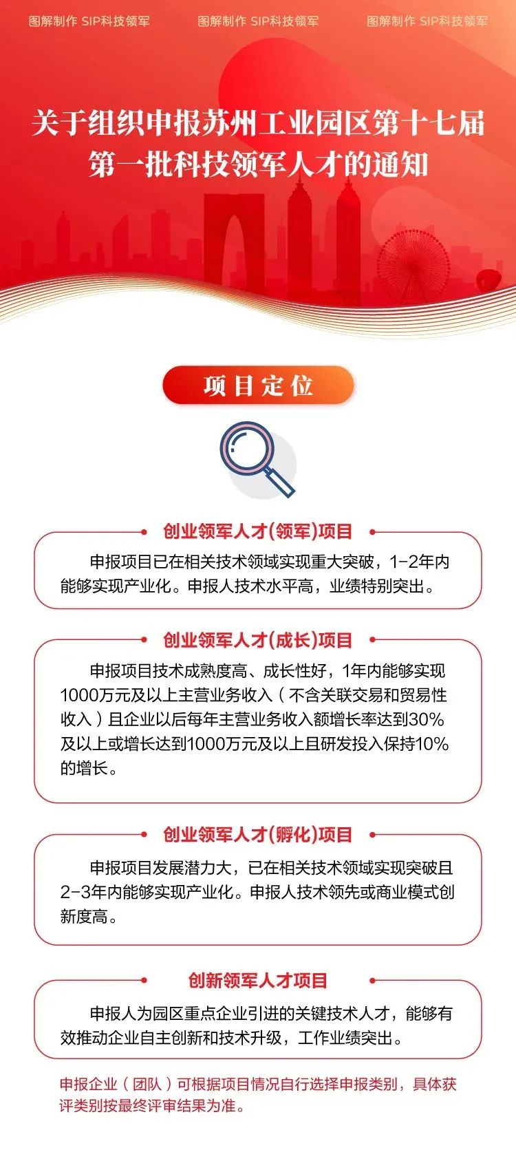 為加快推進開放創(chuàng)新的世界一流高科技園區(qū)建設(shè),進一步加大高層次創(chuàng)新、創(chuàng)業(yè)領(lǐng)軍人才(團隊)引進力度,不斷提升園區(qū)創(chuàng)新源地、產(chǎn)業(yè)高地建設(shè)水平,現(xiàn)啟動第十七屆第一批園區(qū)科技領(lǐng)軍人才創(chuàng)新創(chuàng)業(yè)工程的申報工作。本屆科技領(lǐng)軍人才分兩批次集中受理評審,目前第一批正在申報。歡迎申報,載體請選擇:蘇州工業(yè)園區(qū)科技招商中心!