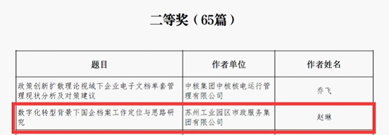 據(jù)悉,今年 3 月,中國(guó)檔案學(xué)會(huì)面向全國(guó)青年檔案工作者開始論文征集,并收到投稿論文 1191 篇。中國(guó)檔案學(xué)會(huì)組織專家對(duì)入選論文進(jìn)行了認(rèn)真評(píng)審,評(píng)出一等獎(jiǎng)?wù)?/span>文 50 篇、二等獎(jiǎng)論文 65 篇、三等獎(jiǎng)?wù)撐? 85 篇、入選論文 777 篇。近年來(lái),園區(qū)檔案管理中心積極開展檔案科研工作,承擔(dān)多項(xiàng)國(guó)家、省、市課題,園區(qū)檔案工作者積極參與國(guó)家、省、市檔案學(xué)術(shù)交流,在《中國(guó)檔案》《檔案與建設(shè)》等核心期刊發(fā)表論文 10 余篇,在宣傳園區(qū)檔案工作,推動(dòng)園區(qū)及蘇州檔案事業(yè)高質(zhì)量發(fā)展上做出積極貢獻(xiàn)。