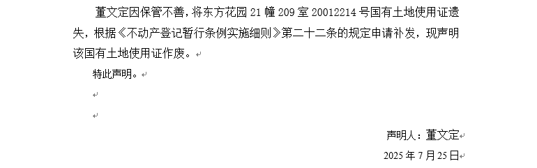 關于東方花園21幢209室20012214號國有土地使用證遺失聲明