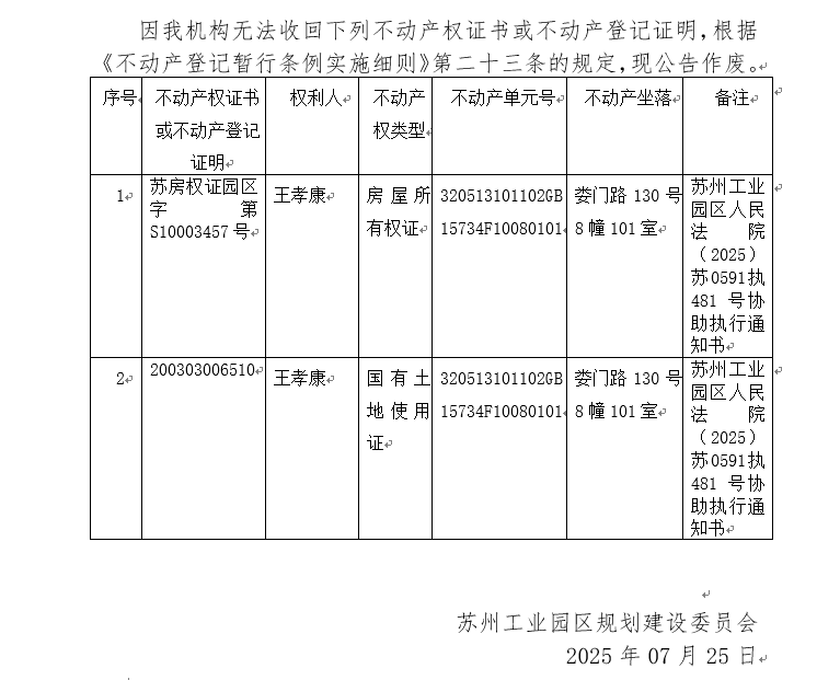 不動(dòng)產(chǎn)權(quán)證書/登記證明作廢公告蘇園 證廢字2025(0100)號(hào)(婁門路130號(hào)8幢101室)