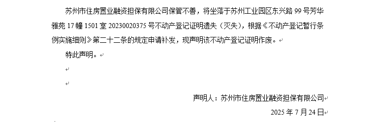 關于蘇州工業園區東興路99號芳華雅苑17幢1501室20230020375號不動產登記證明遺失聲明
