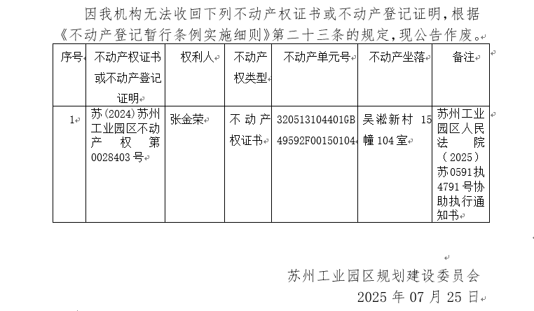 不動產權證書/登記證明作廢公告蘇園 證廢字2025(0098)號(吳淞新村15幢104室)