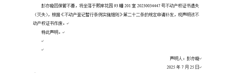 關(guān)于熙岸花園93幢201室20230034447號不動產(chǎn)權(quán)證書遺失聲明