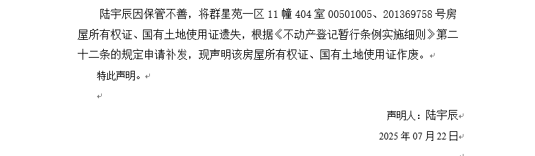 關于群星苑一區11幢404室00501005、201369758號房屋所有權證、國有土地使用證遺失聲明