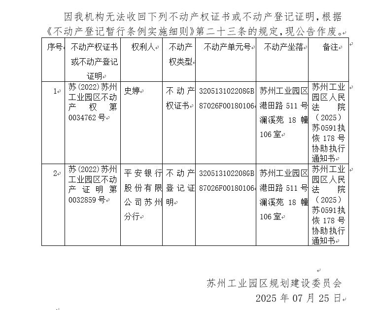 不動產權證書/登記證明作廢公告蘇園 證廢字2025(0097)號(瀾溪苑18幢106室)
