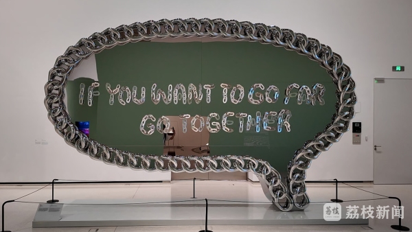 用藝術鏈接過去與將來,交流借鑒與創新發展同行。中國當代藝術標志性人物徐震的巨型裝置《結伴才能行遠》,以涂鴉文字和銀色長鏈構成,傳遞中新結伴同行的概念,彰顯此次中新兩國文化交流展覽的愿景:面向未來,攜手并進。