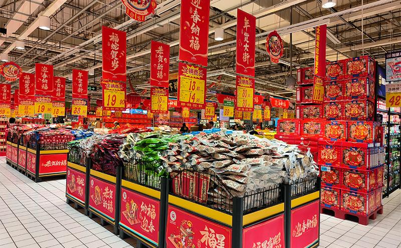 除了鄰里中心,園區可置辦年貨的大型商超還有很多。大潤發金雞湖店同樣布置了年貨大街,對聯、剪紙、中國結、福字、等各種春節飾品,將商場妝點得年味十足。作為一年一度的春節購物狂歡盛典,今年大潤發匯聚了千余款精選年貨商品,從糧油、生鮮、干貨,到酒水、特產,品類齊全,應有盡有。