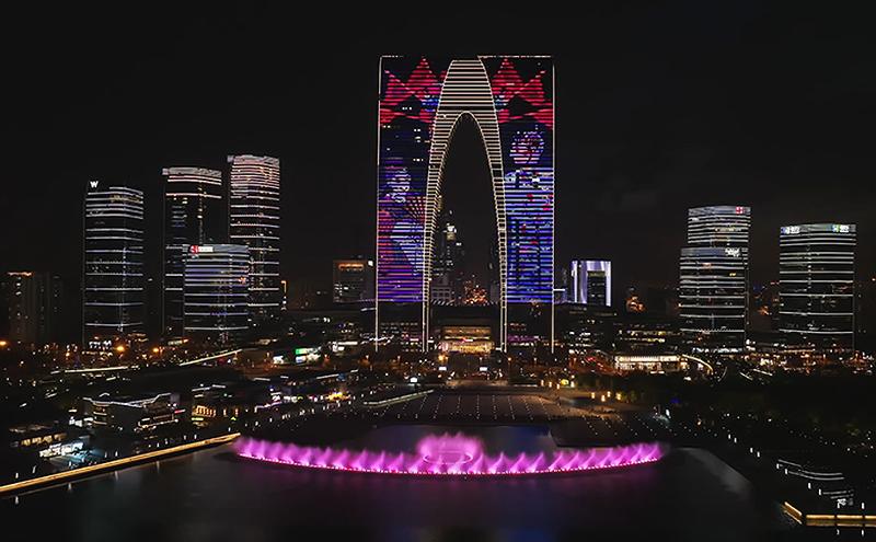 與“蘇州之眼”隔湖相望,金雞湖音樂噴泉作為蘇州旅游的傳統“打卡”項目,同樣讓人流連忘返。