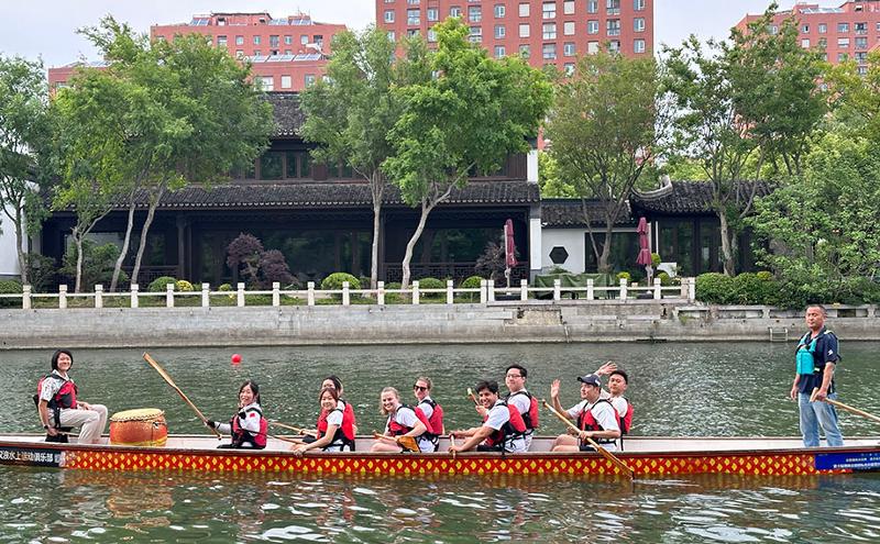 蘇州國際友緣龍舟隊成立于2021年,已多次亮相金雞湖端午龍舟賽場。這支隊伍的成員來自五湖四海,“是緣分讓來自世界各地的我們相聚蘇州,大家熱愛這座城市并組建了這支戰隊,所以取名‘友緣’。”領隊Shirley Tian介紹道。一直以來,蘇州國際友緣龍舟隊始終保持著開放與活力,隊員們每年都會更新迭代,旨在讓更多國際友人體驗劃龍舟的樂趣。
