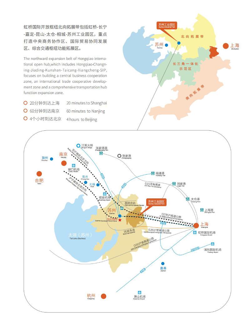 蘇州工業園區是蘇州面向未來的城市新中心,以發達的高速公路、鐵路、水路及航空網與世界各主要城市相連;軌道交通20分鐘到達上海、60分鐘到達南京、4個小時到達北京,是長三角地區重要的總部經濟和商務文化活動中心,是虹橋國際開放樞紐北向拓展帶的重要一環。