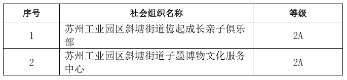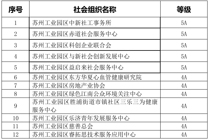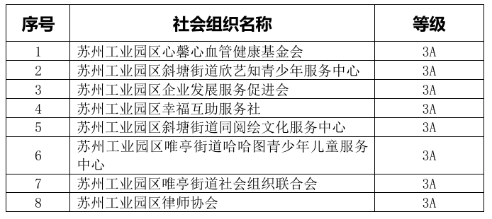 根據(jù)《蘇州市社會(huì)組織評(píng)估管理辦法》和《園區(qū)社會(huì)事業(yè)局關(guān)于開(kāi)展2025年社會(huì)組織等級(jí)評(píng)估工作的通知》(蘇園社〔2025〕11號(hào))的要求,社會(huì)事業(yè)局于2025年7月—2025年11月實(shí)施園區(qū)社會(huì)組織等級(jí)評(píng)估工作。根據(jù)社會(huì)組織歷年年檢情況、社會(huì)組織雙隨機(jī)檢查和定期檢查等結(jié)果,并結(jié)合社會(huì)組織申報(bào)自評(píng)和專(zhuān)家組考評(píng)審定意見(jiàn),現(xiàn)將2025年度社會(huì)組織等級(jí)評(píng)估結(jié)果公示如下: