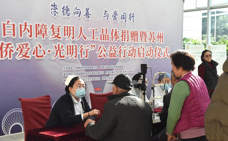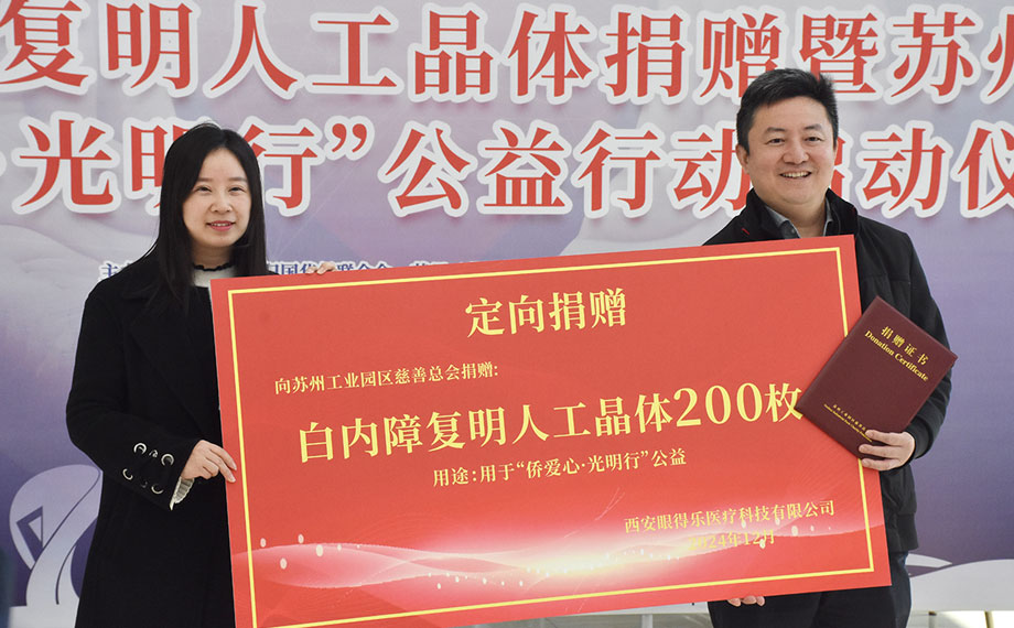 崇德向善,與愛同行。12月24日上午,蘇州“僑愛心·光明行”公益行動啟動儀式在蘇州工業園區舉行?,F場,愛心企業西安眼得樂醫療科技公司向蘇州工業園區慈善總會定向捐贈白內障復明人工晶體200枚,后續將由蘇州九龍醫院推進落實,惠及在蘇僑胞及全市眼部疾病患者。