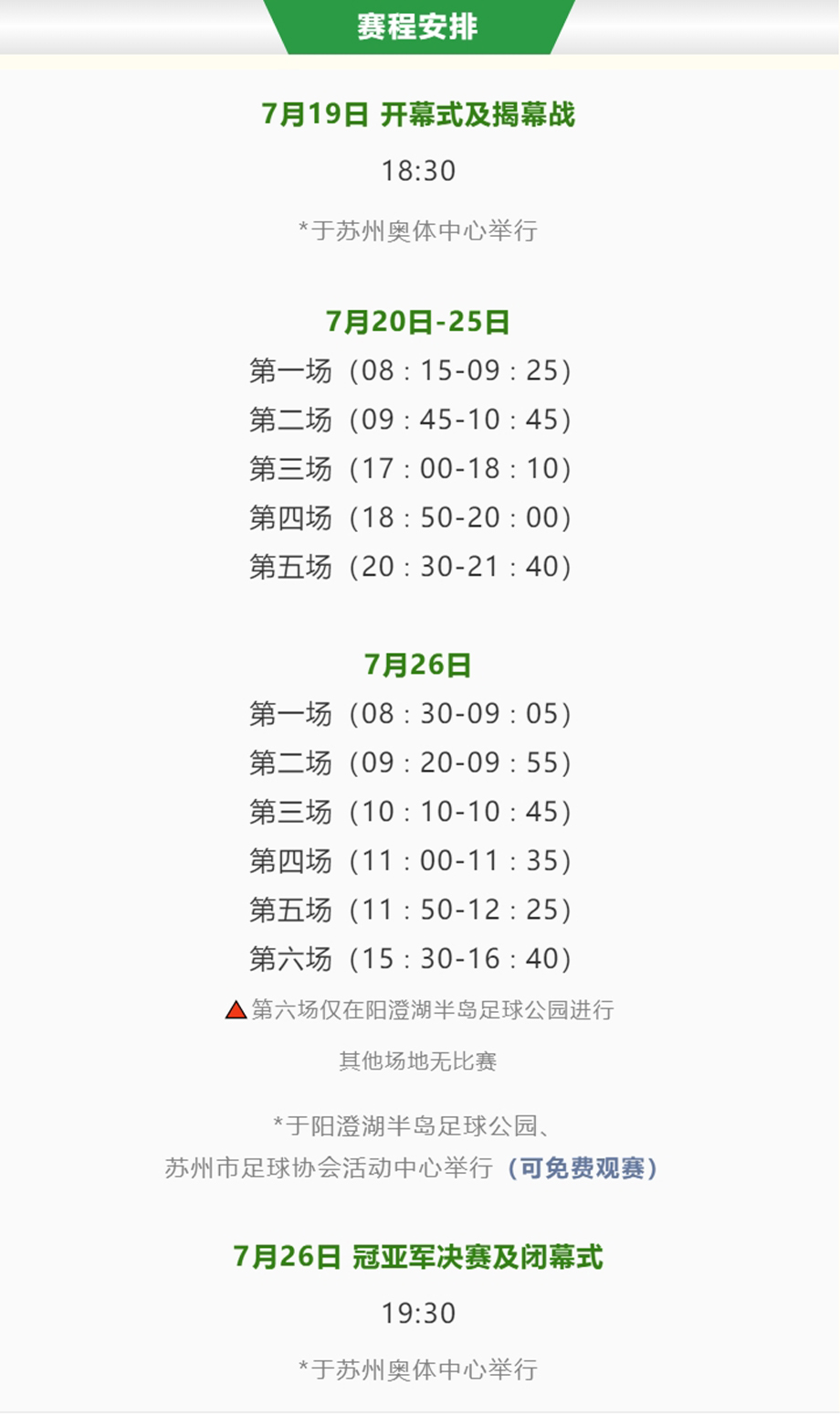本次比賽將在7月19日——7月26日期間舉行,其中五分之四以上場次的賽事(約300多場)將在陽澄湖半島足球公園、蘇州市足球協會活動中心進行,屆時歡迎各位足球迷們前來免費觀賽。