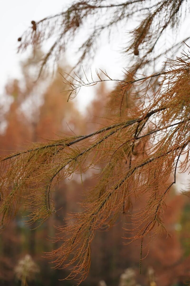 沿斜塘河漫步,成片水杉林沿河岸綿延,形成一道溫暖的濱水風景線。午后陽光穿過赤金色枝葉,在步道上投下斑駁光影,讓河岸變成了一幅絕美的油畫。