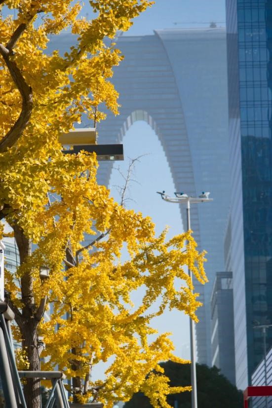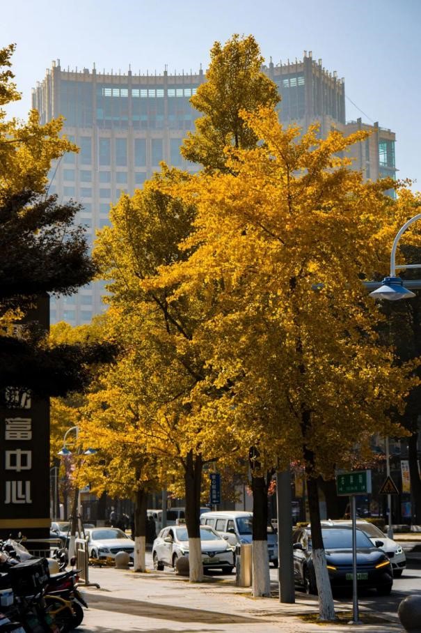 驅車或漫步這條城市中軸線,兩側的高樓構成摩登的天際線,銀杏的金黃主旋律為這幅都市畫卷點上了最明亮的季節色彩。
