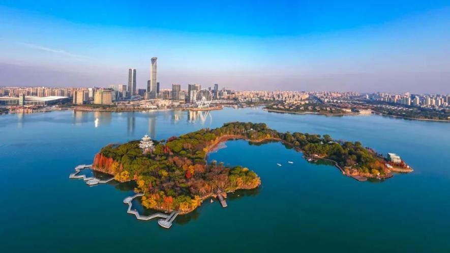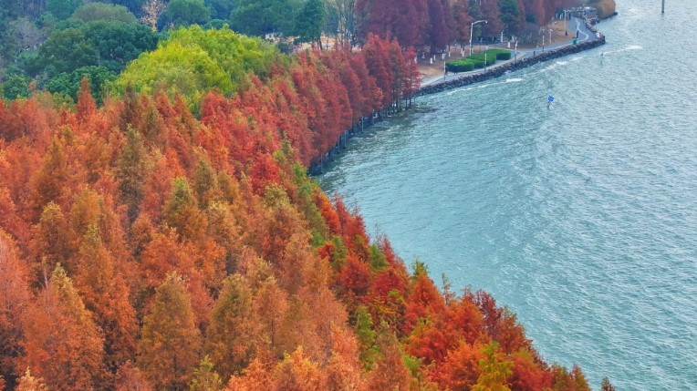 登上桃花島,從空中俯瞰,環島彩林如一道暖色鑲邊,將整座島嶼溫柔環抱。漫步其間,明黃、碎金、朱紅在枝頭交織,偶一抬頭,斑斕枝葉間便框出一幅碧湖映城的別致畫面,靜謐與繁華僅一水之隔。湖畔清風、粼粼波光與咖啡香氣共同醞釀出獨特的島嶼詩意。