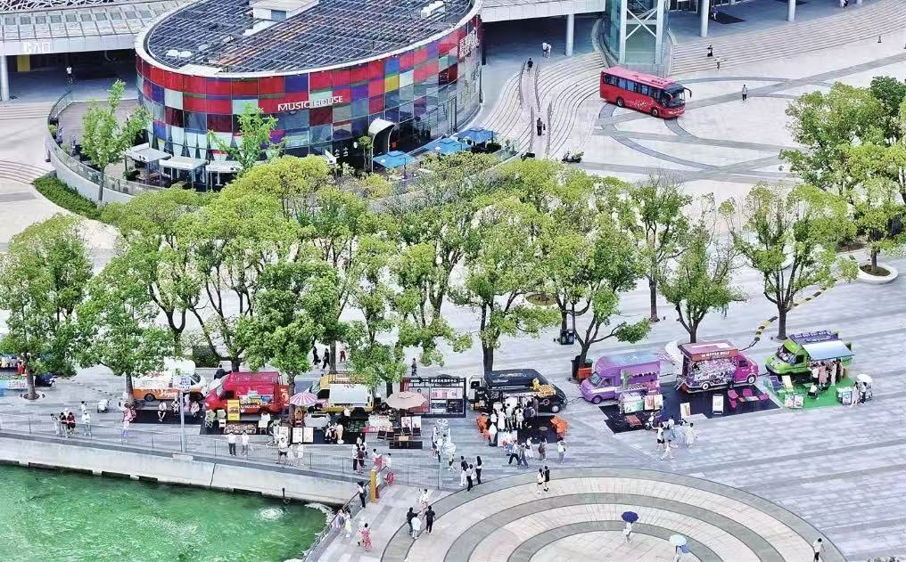 昨日園區金雞湖岸邊,彩色房車市集琳瑯滿目,為過往游客提供冰鎮飲料消暑。這一抹亮麗的多巴胺色為蘇城的盛夏平添了幾分生機與活力。