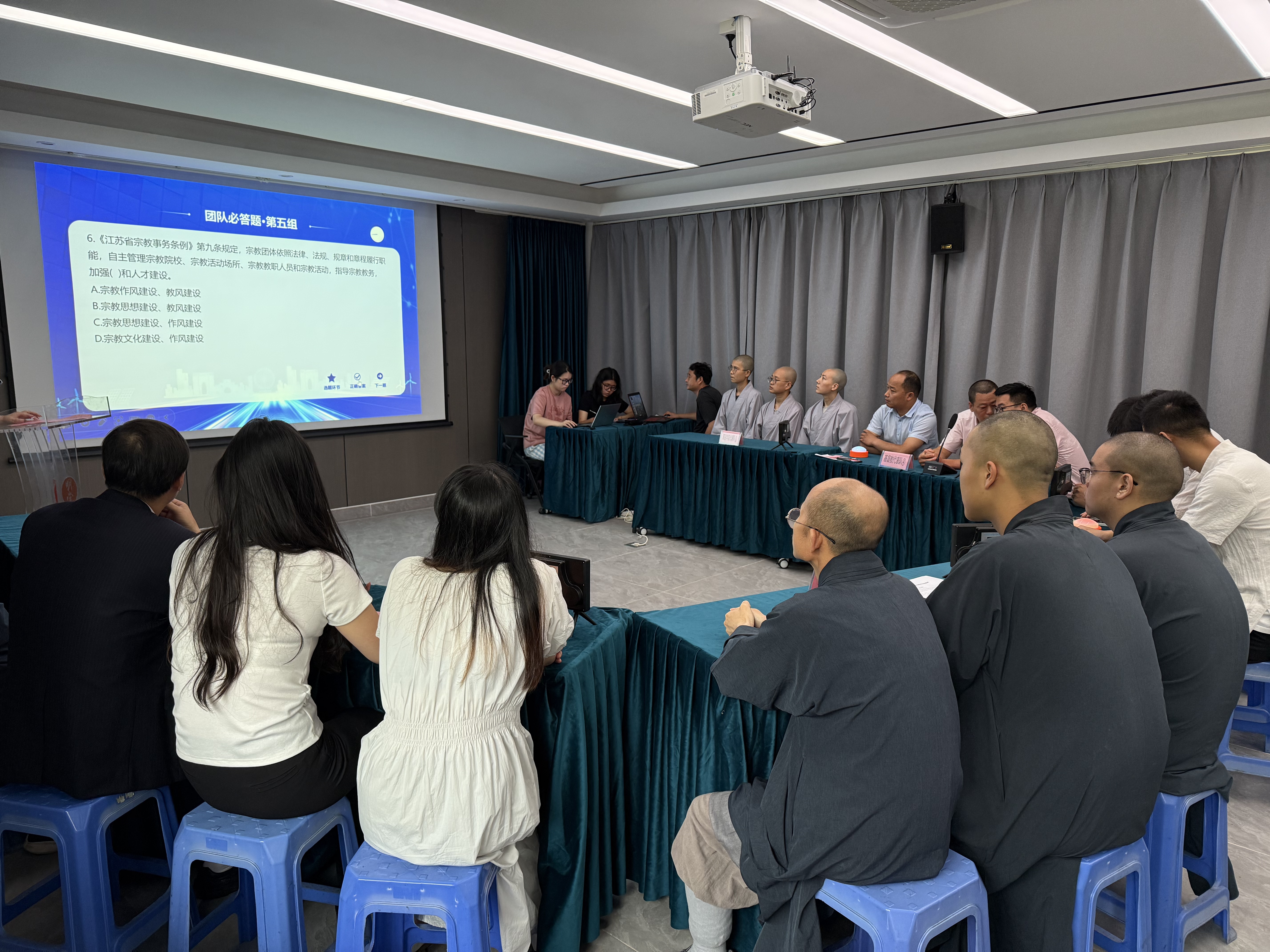 活動(dòng)現(xiàn)場,舉辦了園區(qū)民宗政策法規(guī)知識競賽,園區(qū)佛教協(xié)會(huì)、道教協(xié)會(huì)、天主教愛國會(huì)、基督教三自愛國會(huì)、江蘇佛學(xué)院寒山學(xué)院和江蘇佛學(xué)院清涼學(xué)院各自組建代表隊(duì)參賽,現(xiàn)場六支代表隊(duì)參賽選手在答題環(huán)節(jié)展現(xiàn)出扎實(shí)的法治知識素養(yǎng),體現(xiàn)了園區(qū)宗教代表人士積極學(xué)習(xí)民宗政策法規(guī)的積極態(tài)度和奮發(fā)進(jìn)取的精神面貌。