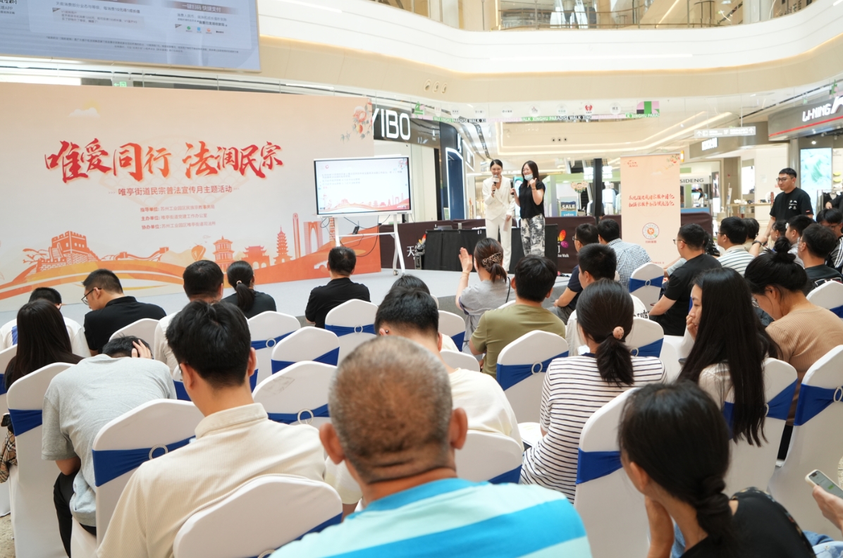 為切實(shí)提升民族宗教政策和法律法規(guī)覆蓋面與知曉度,增強(qiáng)園區(qū)居民民族宗教政策法規(guī)學(xué)習(xí)熱情,6月19日下午,由園區(qū)民宗局指導(dǎo)、唯亭街道辦事處承辦的“唯愛同行 法潤(rùn)民宗”民宗政策法規(guī)主題宣傳活動(dòng)在蘇州星湖龍湖天街圓滿舉辦。唯亭街道辦事處有關(guān)領(lǐng)導(dǎo)、唯亭街道各社區(qū)民宗干部及社會(huì)各族各界群眾代表等100余人參加本次活動(dòng)。