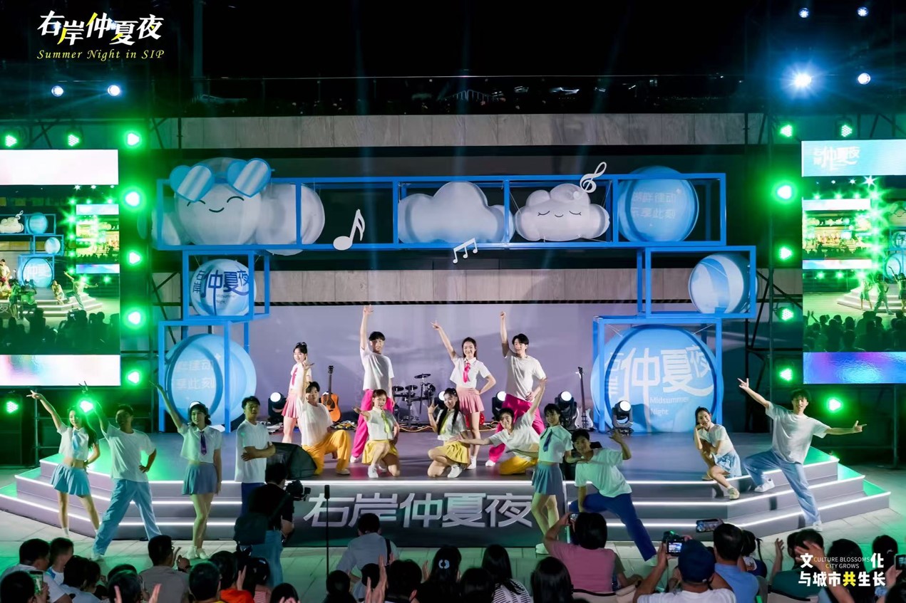 “右岸仲夏夜”推出二期,已成長為園區嶄新的文化IP,不僅為市民奉上豐盛的精神盛宴,更成為展示區域文旅魅力的閃亮名片?!拔規Ш⒆觼磉@邊散步納涼,沒想到碰上這么精彩的演出?!笔忻褛w女士說道,“現在的園區既有煙火氣,又充滿藝術范兒,周末遛娃、全家放松再合適不過?!薄叭瘛⑷g、全域、全時”的理念,讓藝術融入湖畔晚風,成為群眾夏夜消暑納涼的好去處。