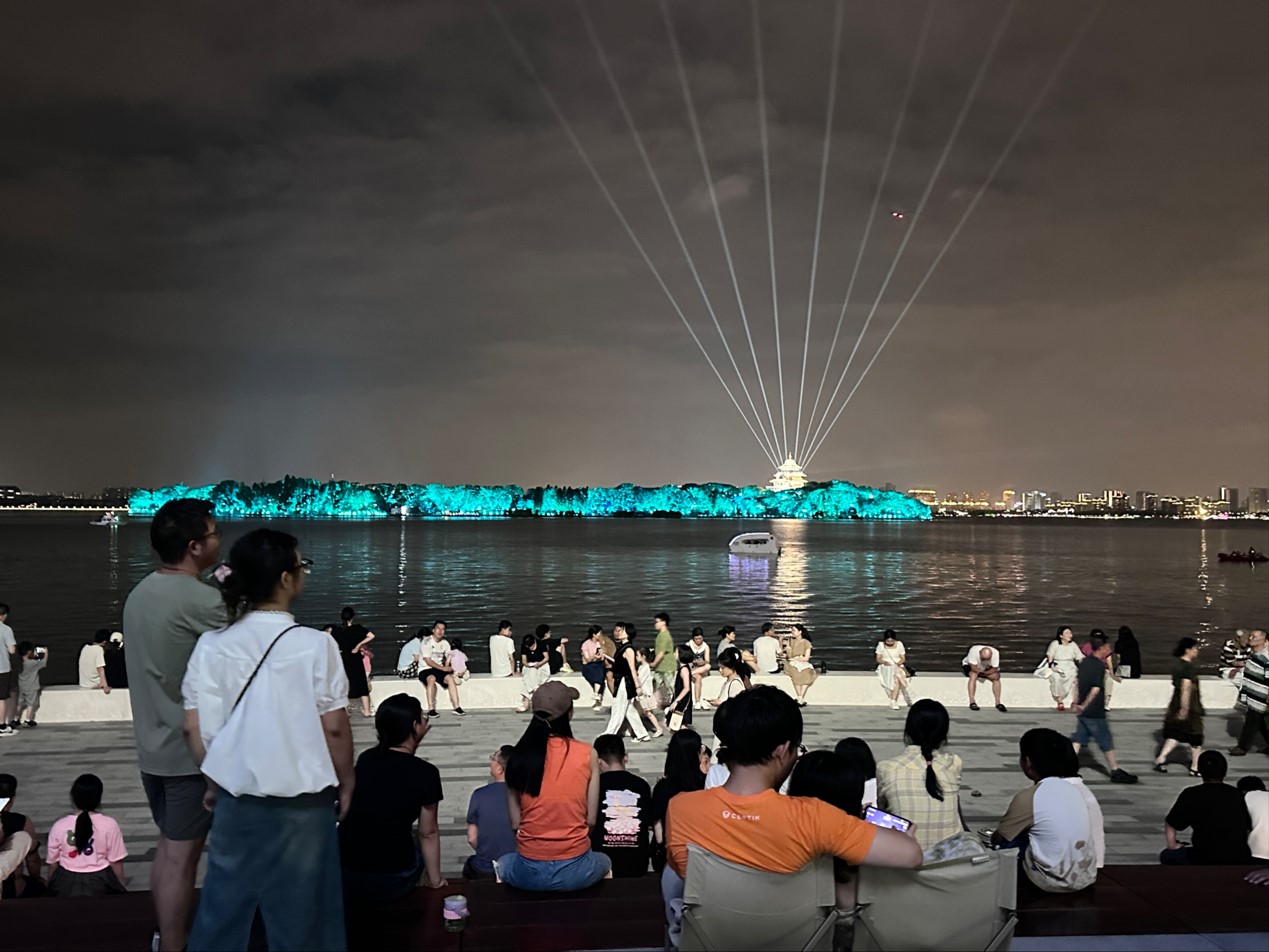 暮色漸濃,舞臺燈光與天邊晚霞相映生輝,將整個場地映照得如夢似幻。右岸客廳下沉廣場四周,人群如潮水般從四面八方涌來,飛翔雕塑下、金雞湖湖畔、摩天輪腳下,處處人頭攢動,將這片開闊空間化作流動的星河。“上周錯過首演,今晚早早就來占座了,家門口的免費演出太棒了?!奔易「浇氖忻癜紫壬y掩興奮。
