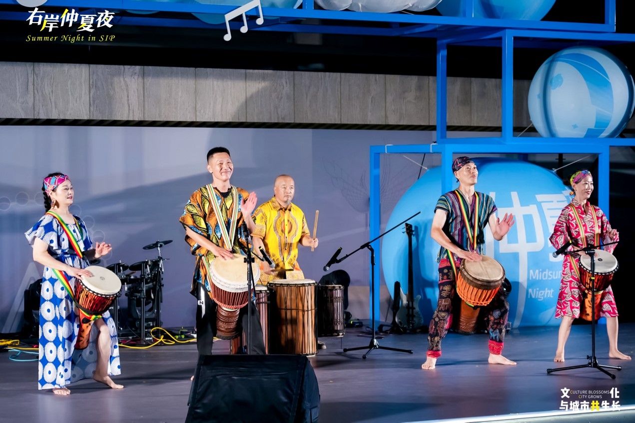 以夏夜星空為幕布,金雞湖右岸客廳今夏搭建起的開放性群眾文化舞臺,整合各界演藝資源,外籍友人、企業高管、本土藝術家等多元主體擔綱舞臺主角,為園區市民和藝術愛好者常態化推出“藝術盲盒”快閃演出。現場,鼓文化藝術館的非洲鼓率先擂響,激昂鼓點如夏夜驟雨,瞬間點燃全場熱情,觀眾們隨著鼓點節奏互動,將氣氛推向高潮。