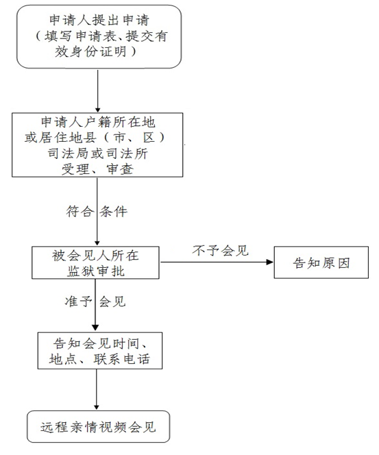 親屬、監護人可以就近向居住地縣級司法行政機關或者司法所提出申請,司法行政機關應當審核其身份,符合會見條件的,通知罪犯所在監獄。監獄準予會見的,司法行政機關應當及時通知罪犯親屬、監護人。
