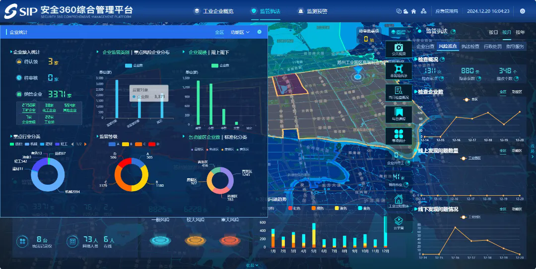 按照“線上管基本、線下管重點”思路,建設了“SIP安全360”綜合監管平臺。線上,1.2萬生產經營單位全面“上線納管”,海量數據集成共享,形成“一風險一檢查”事項,自查內容清單化呈現、檢查復查自動留痕、待辦事項自動提醒。線下,根據企業畫像與“雙標色雙派單”機制,對企業精準分類管理。線上數據流通,線下精準監管,實現了“對優秀企業無事少擾、對問題企業嚴管到位”。