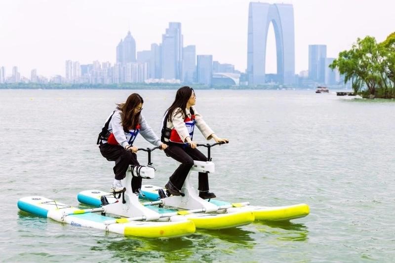 The new routes leading to Taohua Island located in the center of Jinji Lake have become popular recently. Lots of people have tried cycling on water, or gliding through the emerald waves in a new energy mini yacht.