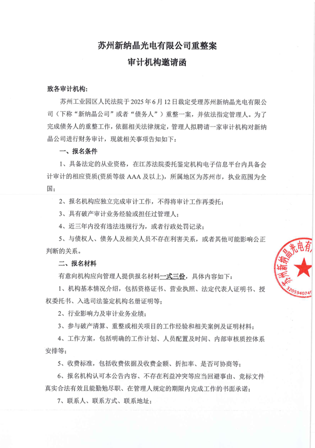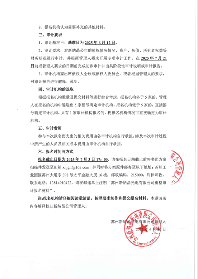 蘇州新納晶光電有限公司關(guān)于公開招募審計(jì)機(jī)構(gòu)的公告