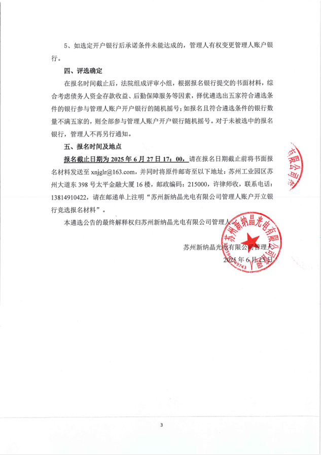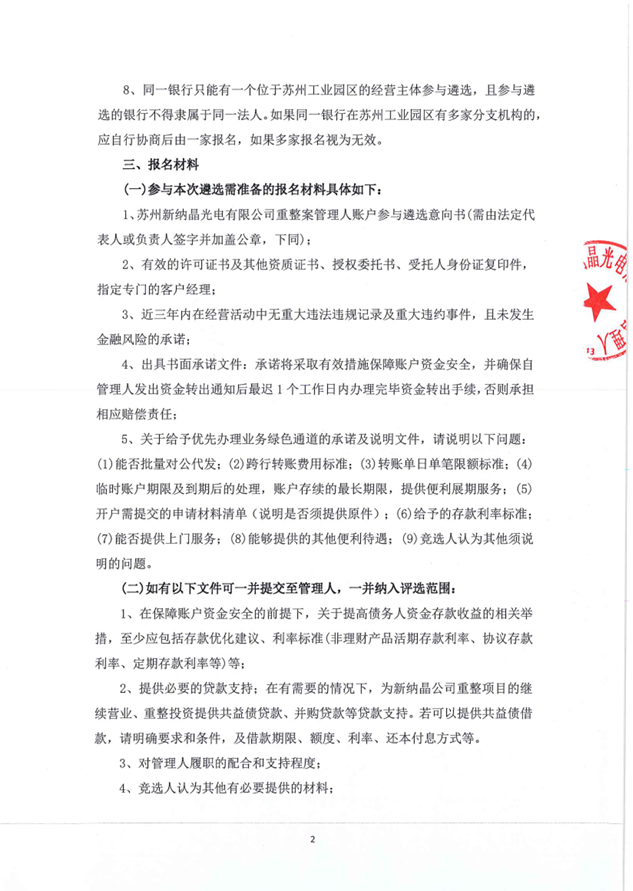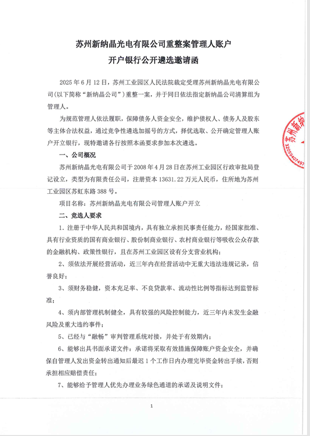 蘇州新納晶光電有限公司重整案管理人賬戶開戶銀行公開遴選邀請函