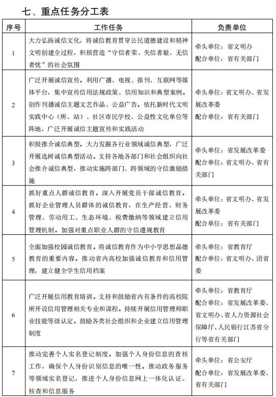 (三)強化責任落實。各地各部門要結合工作實際,強化協同聯動,細化任務分工,認真抓好個人誠信體系建設各項工作。省社會信用綜合管理部門要及時總結個人誠信體系建設工作成效,推廣可復制、可借鑒的創新做法。鼓勵和調動社會力量廣泛參與“誠信江蘇”建設,提高社會關注度、認知度、感受度,形成個人誠信建設的強大合力。