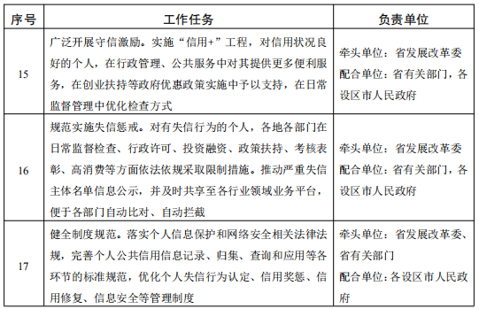 (三)加強個人信用信息共享。依托省市公共信用信息系統,完善個人信用管理功能,推動與省人口信息庫、省公共數據平臺、有關行業信息系統的個人信用信息共享。制定統一的個人公共信用信息目錄,以重點職業人群信用信息歸集為突破口,規范開展個人資格資質、表彰獎勵、公共事業費欠繳、金融活動、行政許可、行政處罰、信用承諾及履諾等信用信息的歸集共享。加快推動省公共信用信息系統與金融信用信息基礎數據庫的個人信用信息共享。