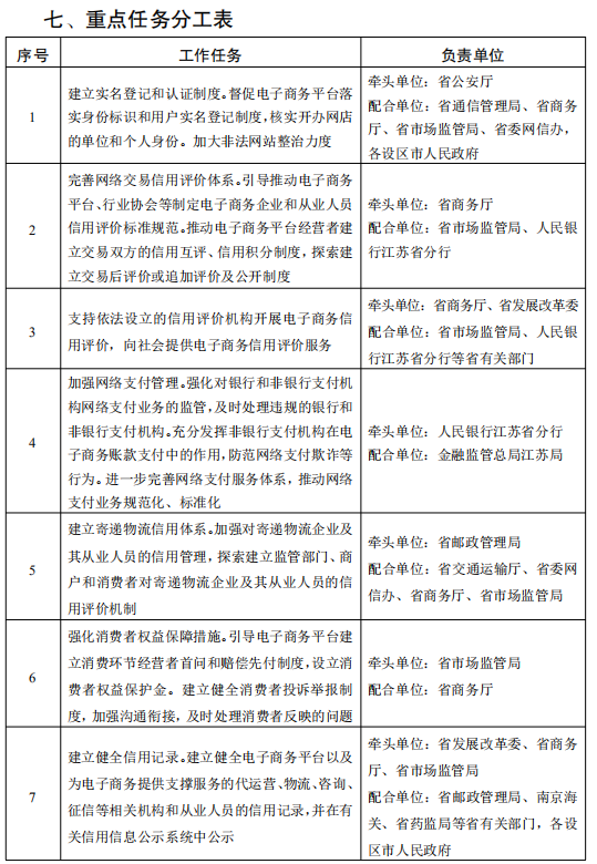 (一)加強統籌協調和監督指導。網信、發展改革、工業和信息化、市場監管、商務、人民銀行、公安、交通運輸、海關、藥品監管、郵政、通信、稅務等相關部門,要按照本實施意見的任務分工,切實抓好工作落實,并建立健全協同監管機制,創新監管方式,全面提升電子商務領域誠信建設水平。