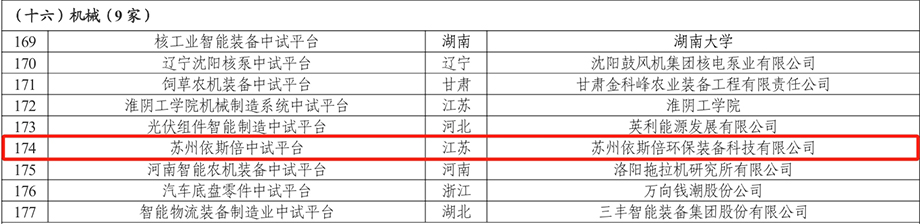 近日,中華人民共和國工業和信息化部公布了首批工業和信息化部重點培育中試平臺初步名單,蘇州陽澄湖半島旅游度假區企業——蘇州依斯倍環保裝備科技有限公司的蘇州依斯倍中試平臺榜上有名。