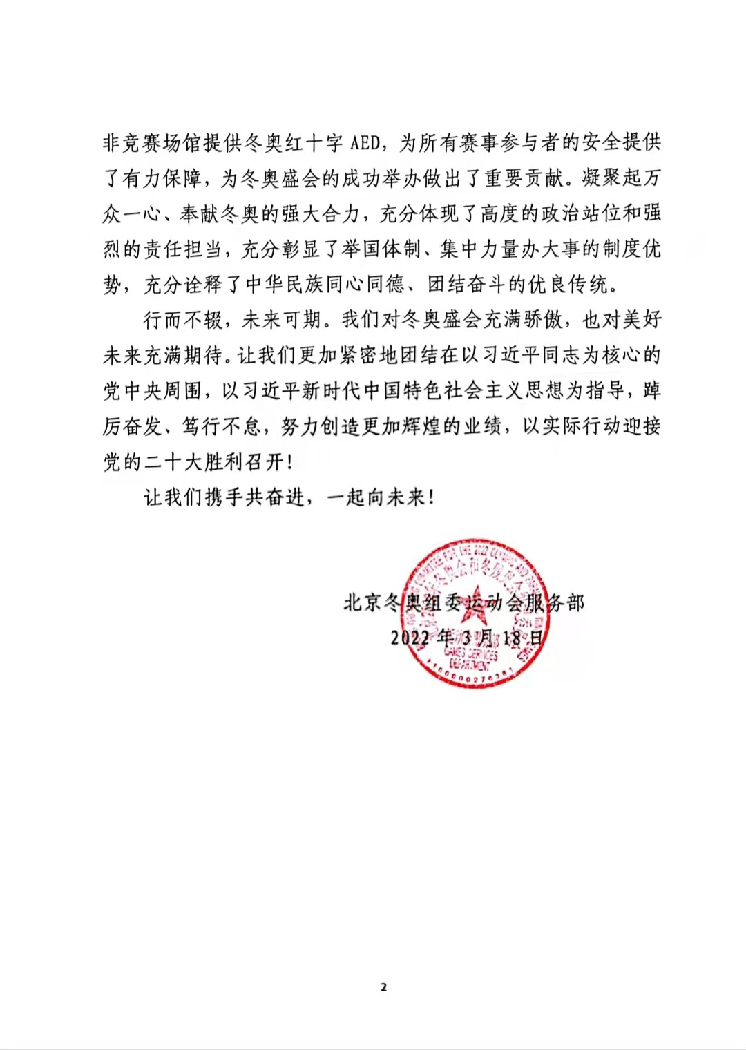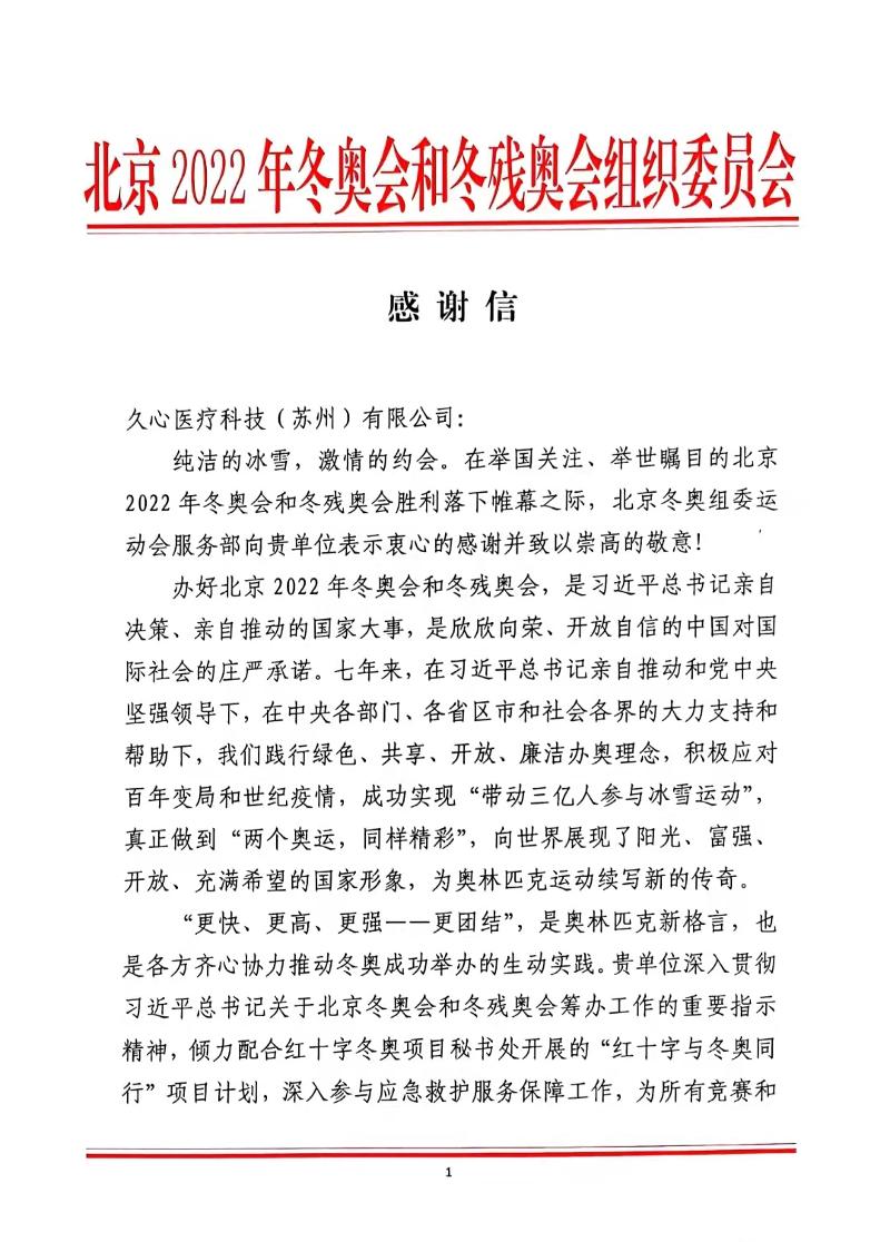 近日,區人大代表孫建燕所在的久心醫療科技(蘇州)有限公司收到這樣一封特殊的感謝信,信中冬奧殘奧組委會向其積極為賽事提供AED表達了真摯的感謝之情。